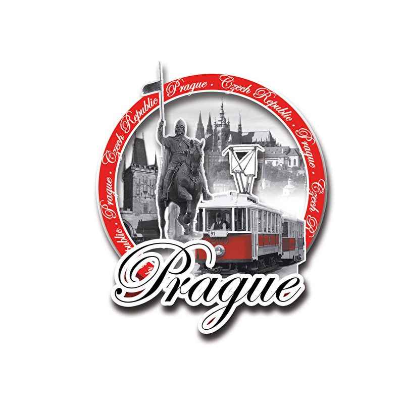 Dřevěný magnet s motivem představujícím hlavní pražské památky – panorama Hradu, Karlův most, Staroměstské náměstí, Pražský orloj, historickou tramvaj.