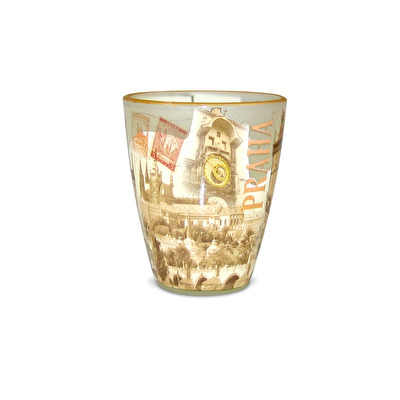 Skleněná miniatura celoplošně potištěná v sépiových barvách ve stylu retro s obrázkem Prahy zobrazujícím Pražský orloj, Karlův most, Pražský hrad a Staroměstské náměstí.