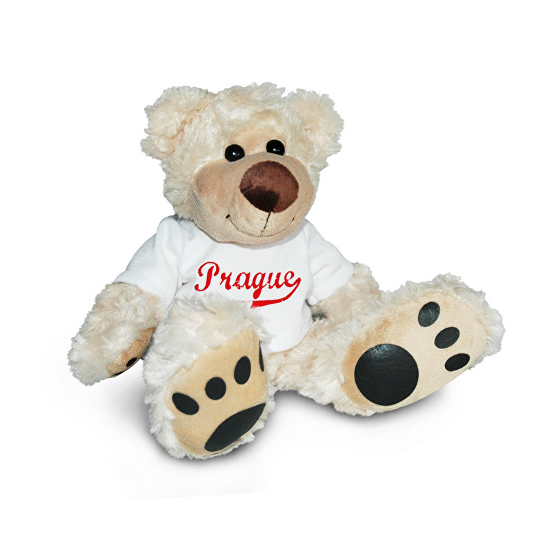 Béžový plyšový méďa v bílém tričku s potiskem Prague.
