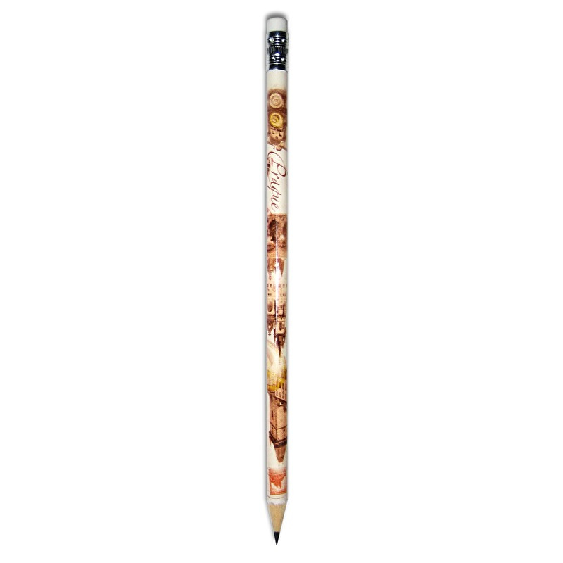 Obyčejná tužka v sépiových barvách ve stylu retro s obrázkem Prahy zobrazujícím Pražský orloj, Karlův most, Pražský hrad a Staroměstské náměstí.