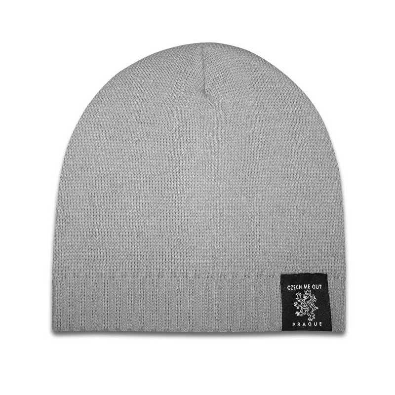 Světle šedá zimní čepice se štítkem s motivem Českého lva.