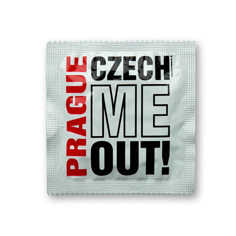 Prezervativ s nápisem Czech Me Out, který znamená v překladu „Vyzkoušej mě“.