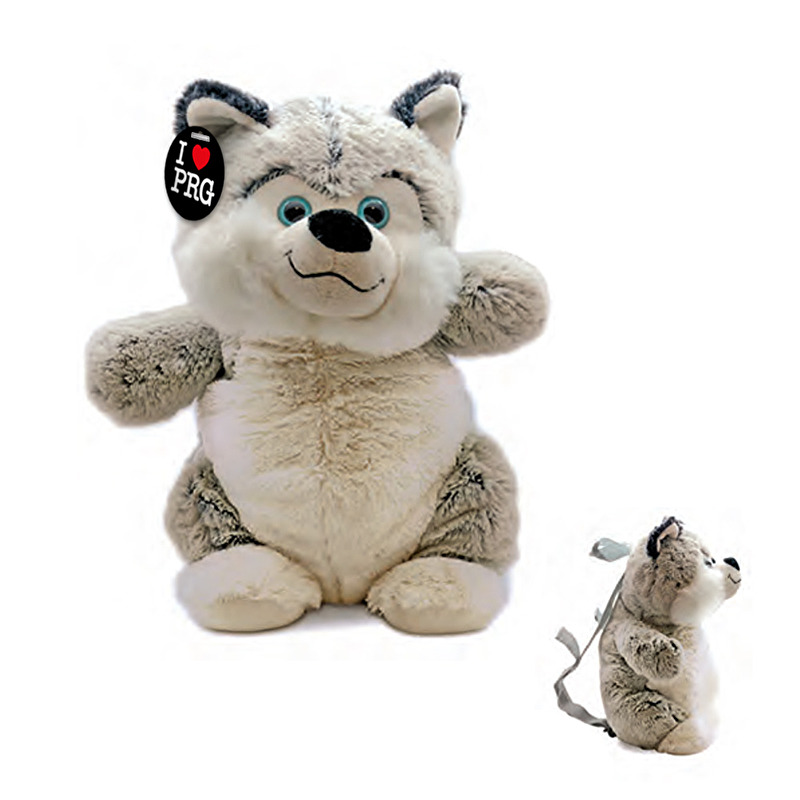 Dětský plyšový batoh husky s jednou kapsou na uložení věcí a nastavitelnými popruhy. V uchu má černé kolečko s nápisem I love PRG.