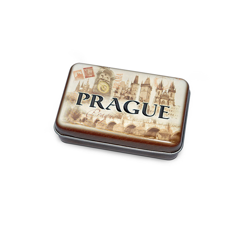 Plechová krabička v sépiových barvách ve stylu retro s obrázkem Prahy zobrazujícím Pražský orloj, Karlův most, Pražský hrad a Staroměstské náměstí. Náplní krabičky jsou mandle v čokoládě se skořicí.