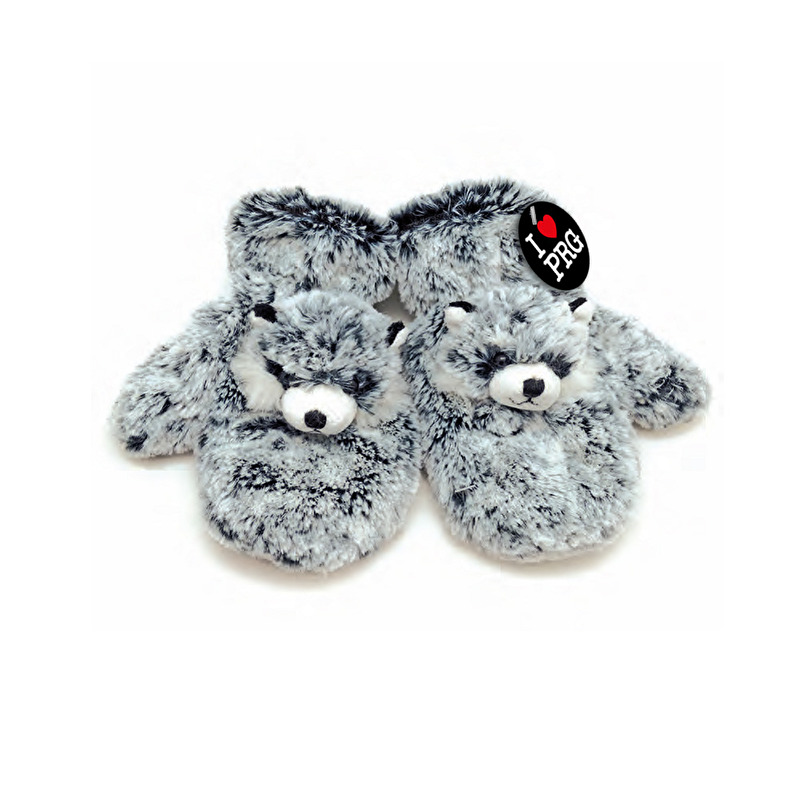 Dětské zimní rukavice z příjemného plyše s motivem vlka a se štítkem I love PRG.