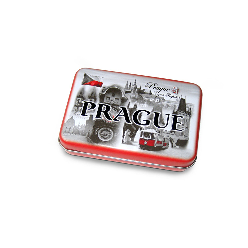 Plechová krabička s motivem představujícím hlavní pražské památky – panorama Hradu, Karlův most, Staroměstské náměstí, Pražský orloj, historickou tramvaj.