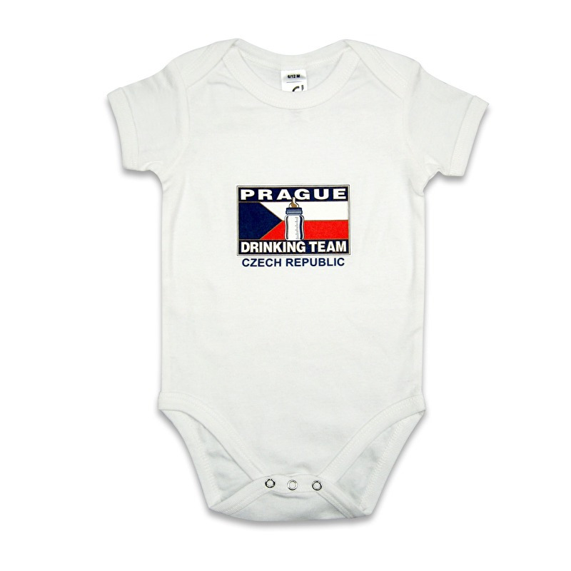 Bílé bavlněné dětské body s motivem dětského Drinking Teamu. Dětské body je v nabídce ve třech velikostech.