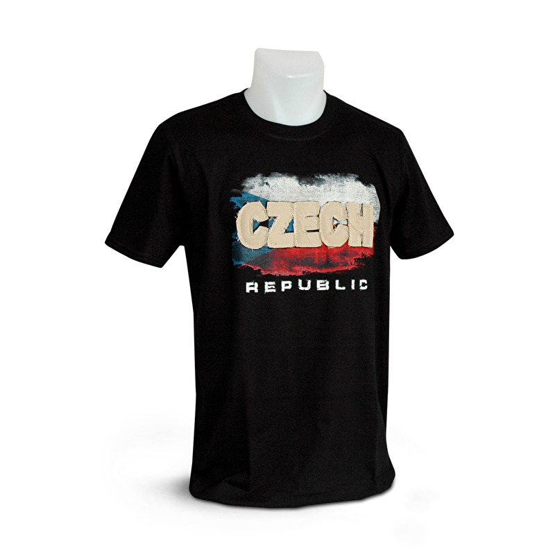 Bavlněné černé tričko s tiskem české vlajky a textilní aplikací.