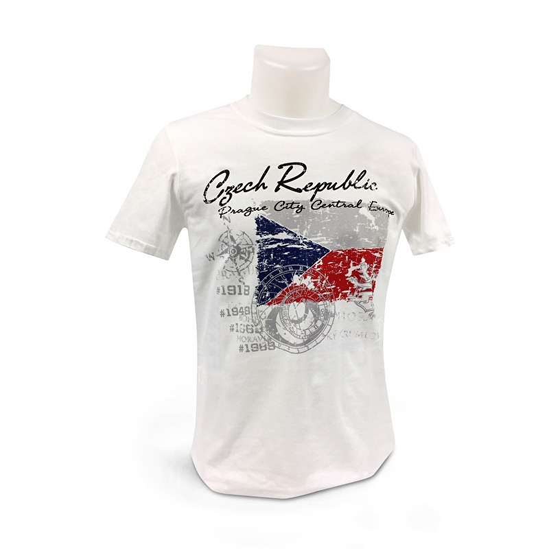 Bílé kvalitní bavlněné prodyšné tričko s nápisem Czech Republic, obrázkem vlajky České republiky a s významnými historickými daty.