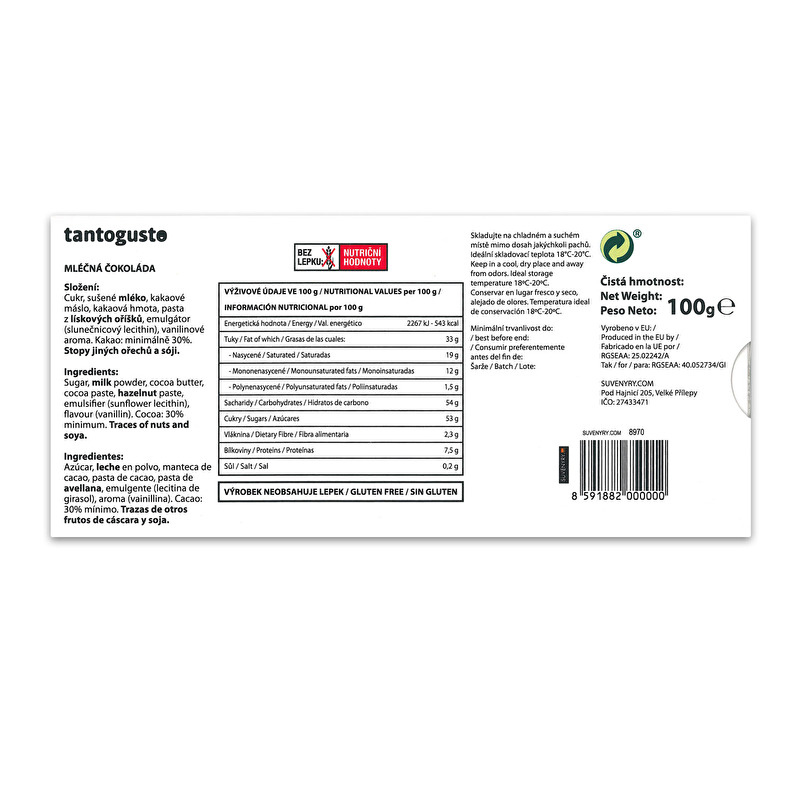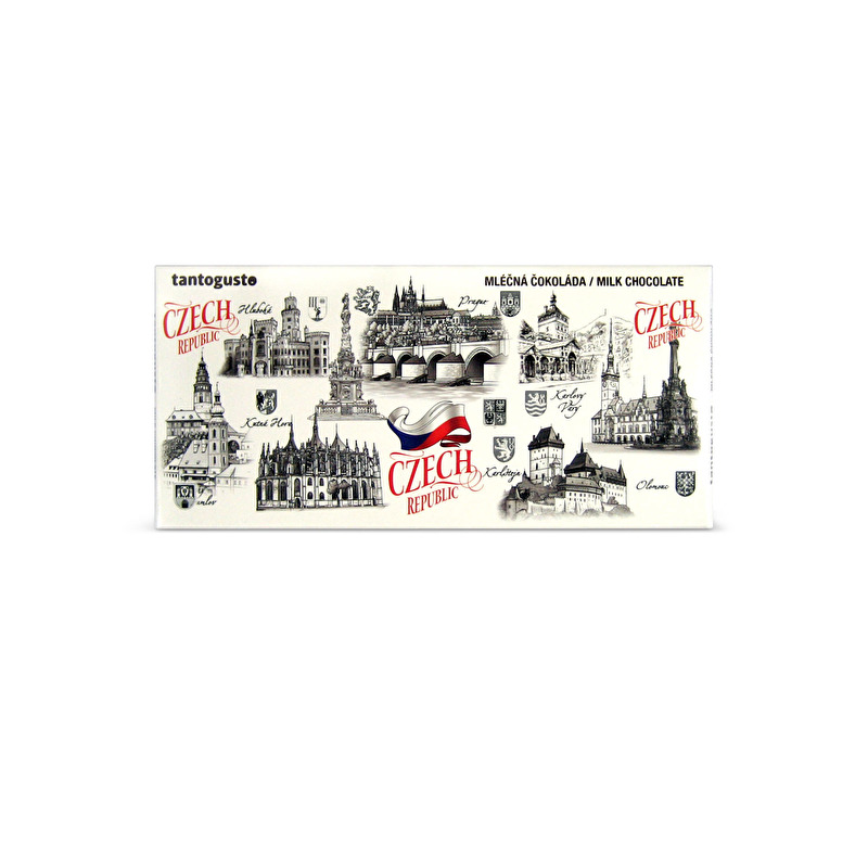 Mléčná čokoláda v papírové krabičce s motivem České republiky a nápisem Czech Republic.