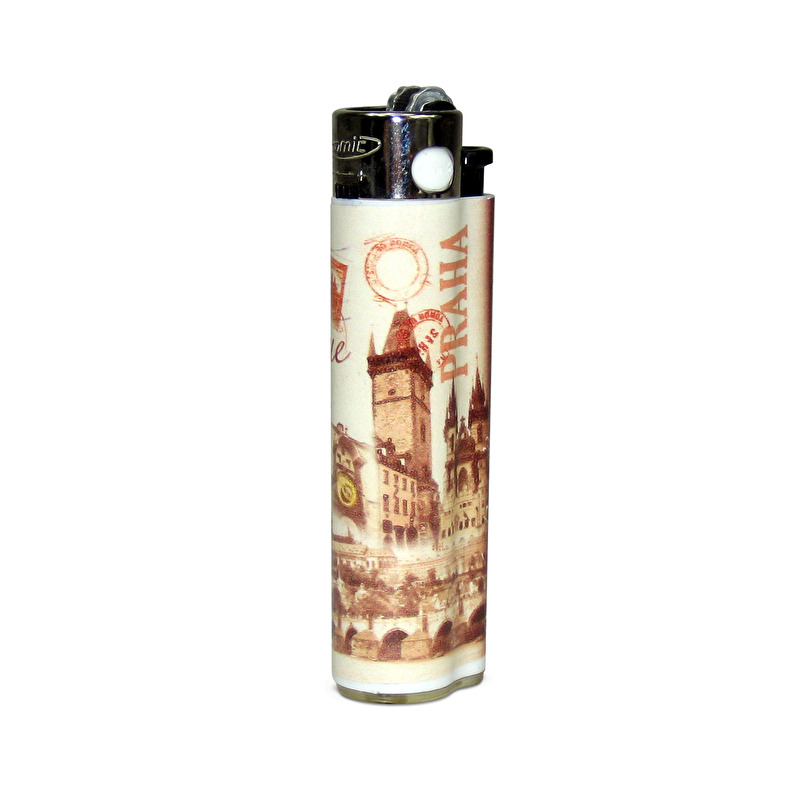 Plnící plynový kulatý zapalovač s motivem Prahy v sépiových barvách.