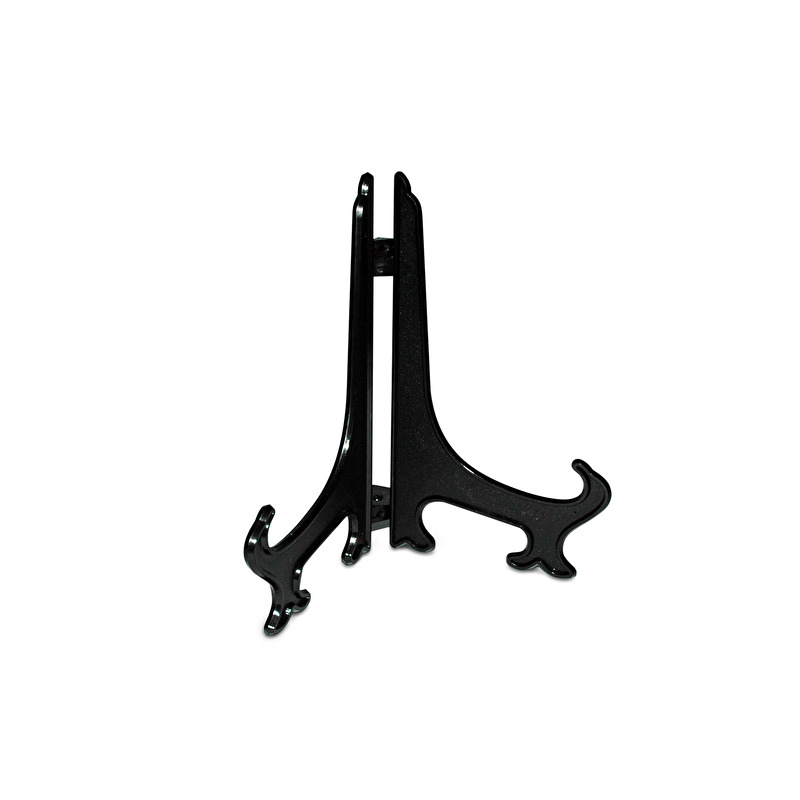Střední umělohmotný stojánek na talíře o průměru 15 cm.