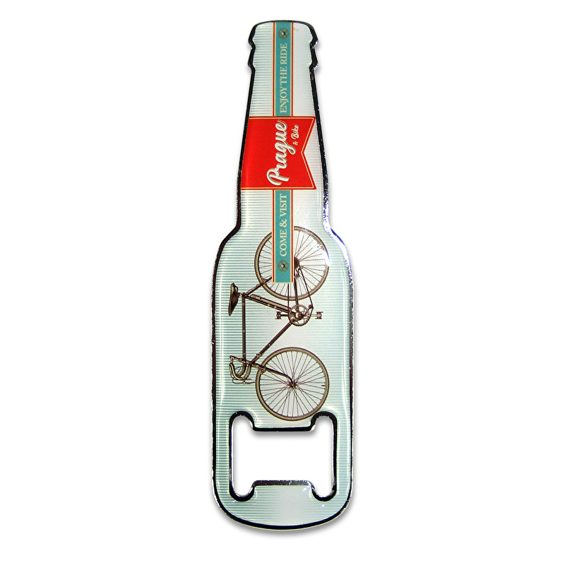 Kovový magnet otvírák ve tvaru lahve s pin-up obrázkem silničního kola.