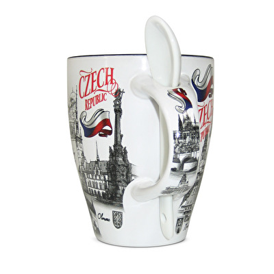 Keramický hrníček se lžičkou s obrázky památek z Karlových Varů, Karlštejna, Českého Krumlova, Kutné Hory, Prahy a Olomouce.