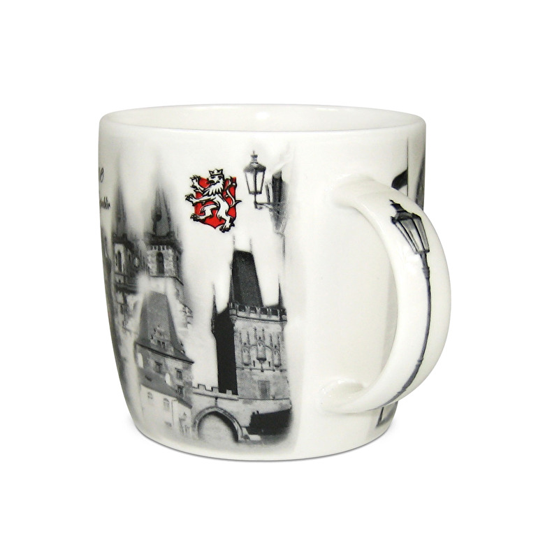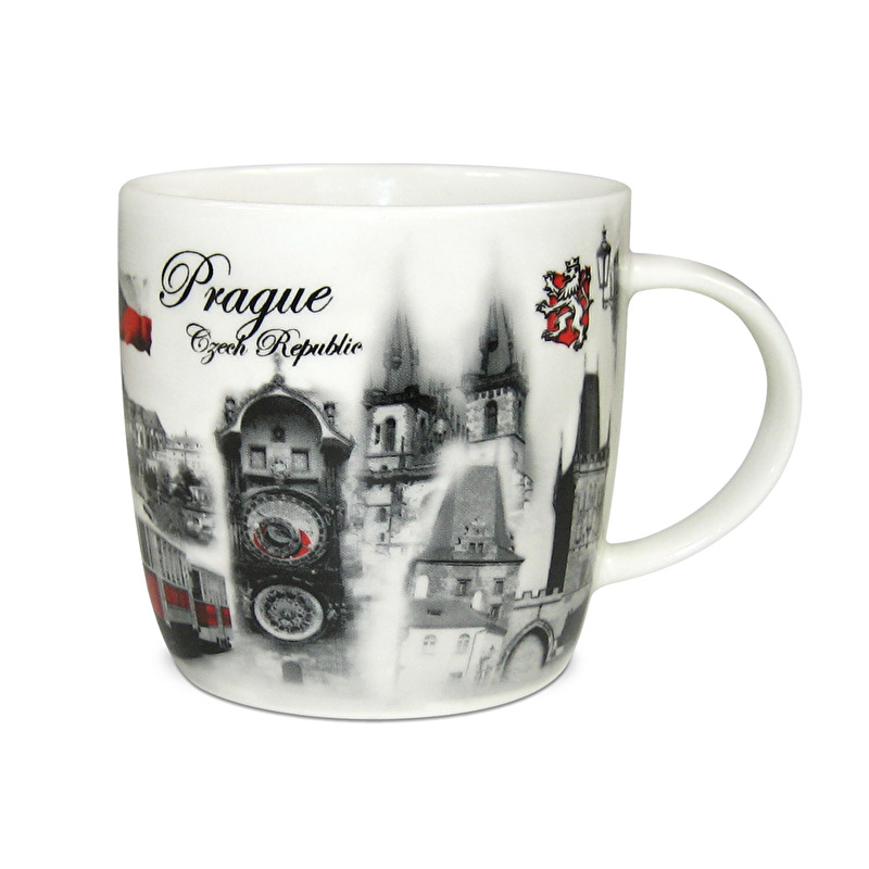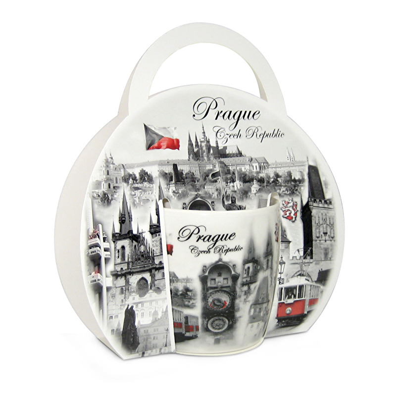 Dárkově zabalený hrnek s potiskem černobílé Prahy s červenu historickou tramvají.