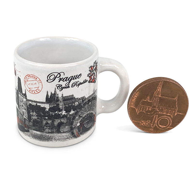 Miniatura hrníčku s potiskem Prahy. Rozměry: výška 3 cm Materiál: porcelán