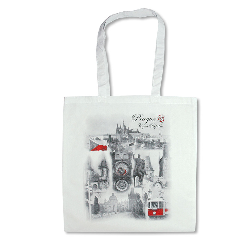 Bílá plátěná taška s motivem představujícím hlavní pražské památky – panorama Hradu, Karlův most, Staroměstské náměstí, Pražský orloj, historickou tramvaj.