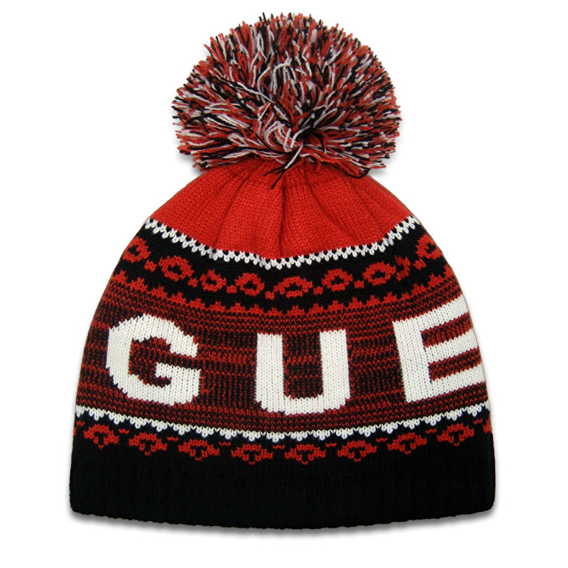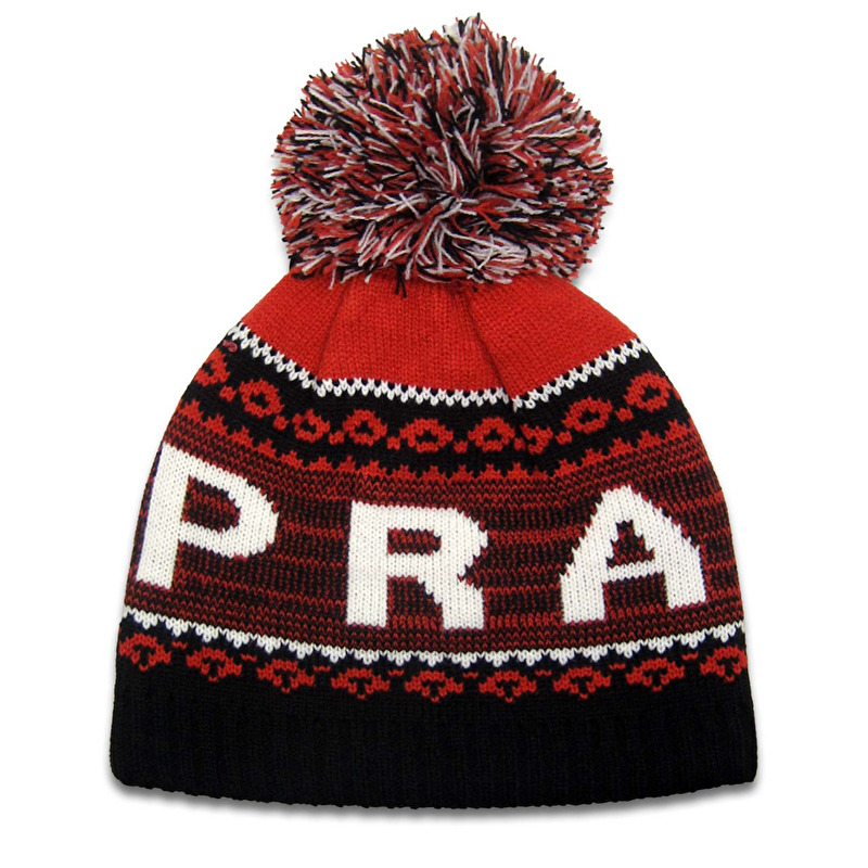 Zimní kulich s bambulí v černo-cihlové barvě a nápisem PRAGUE.