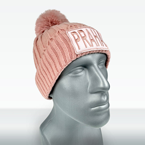 Zimní čepice s bambulí v pestrých barvách s nápisem PRAGUE.