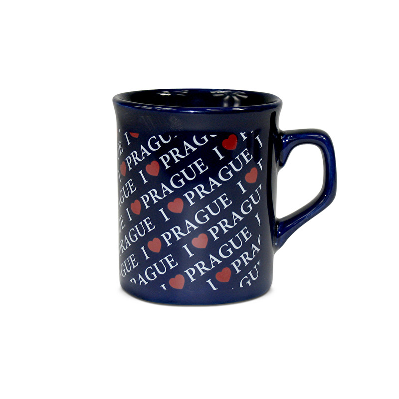 Tmavě modrý hranatý keramický hrníček s nápisy I Love Prague.