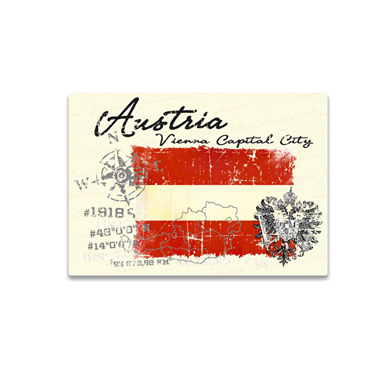 Dřevěný magnet s vlajkou Rakouska a nápisem Austria.