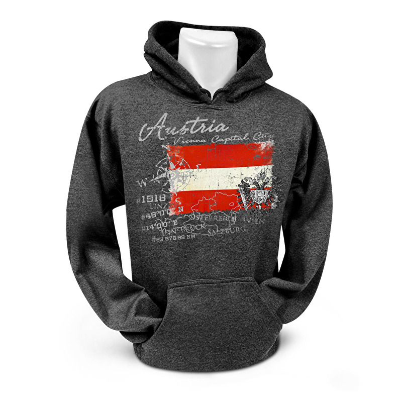 Tmavě šedá stylová mikina s nápisem Austria, obrázkem vlajky Rakouska, kapucí a klokaní kapsou.