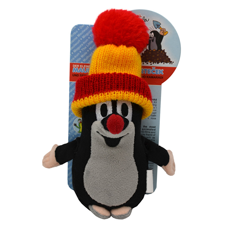 Krteček z příjemného mikroplyše se sundavacím červeno-žlutým kulichem.