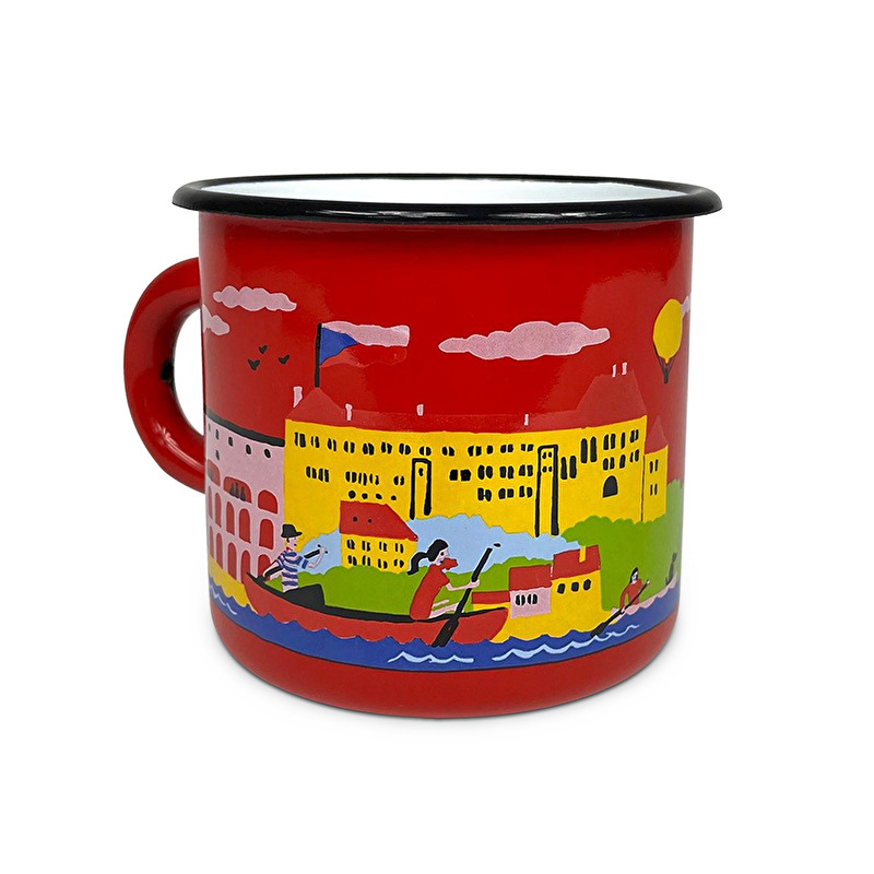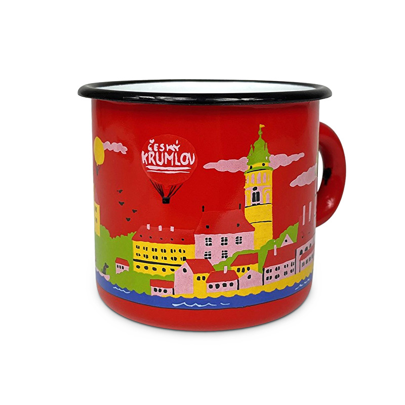 Červený plechový hrnek s motivem Českého Krumlova.