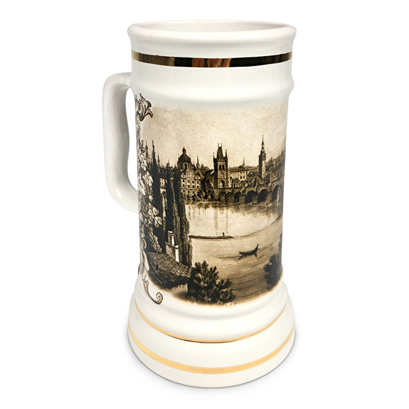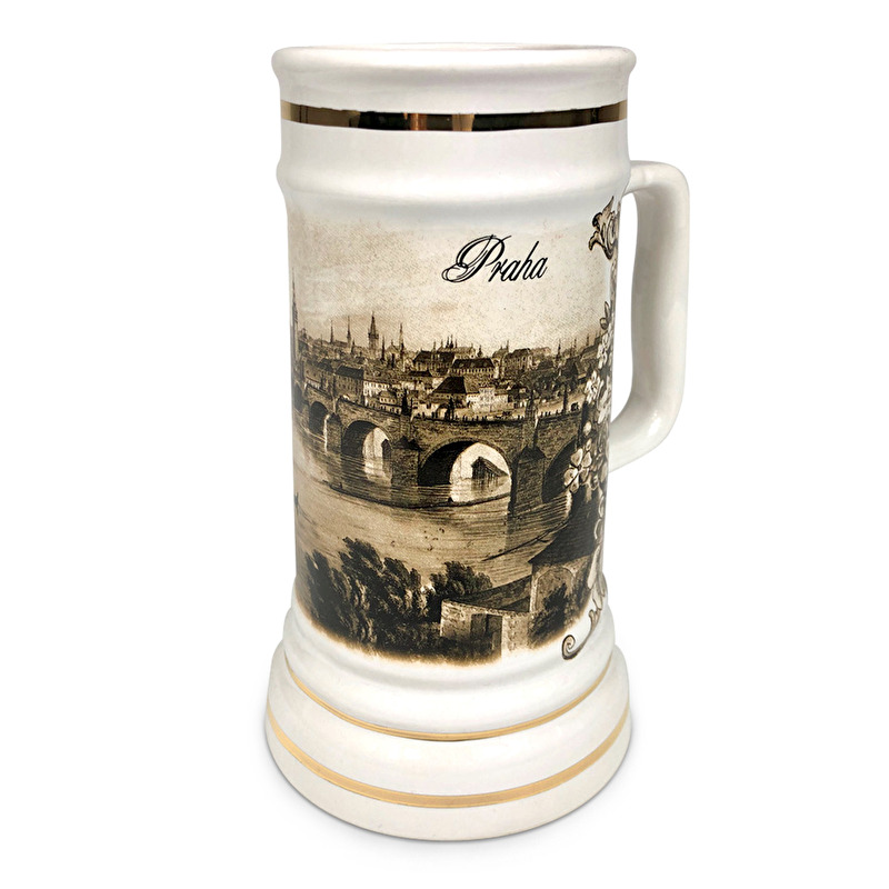 Vysoký bílý glazurovaný korbel z keramiky s obrázkem Prahy a zlatým lemováním