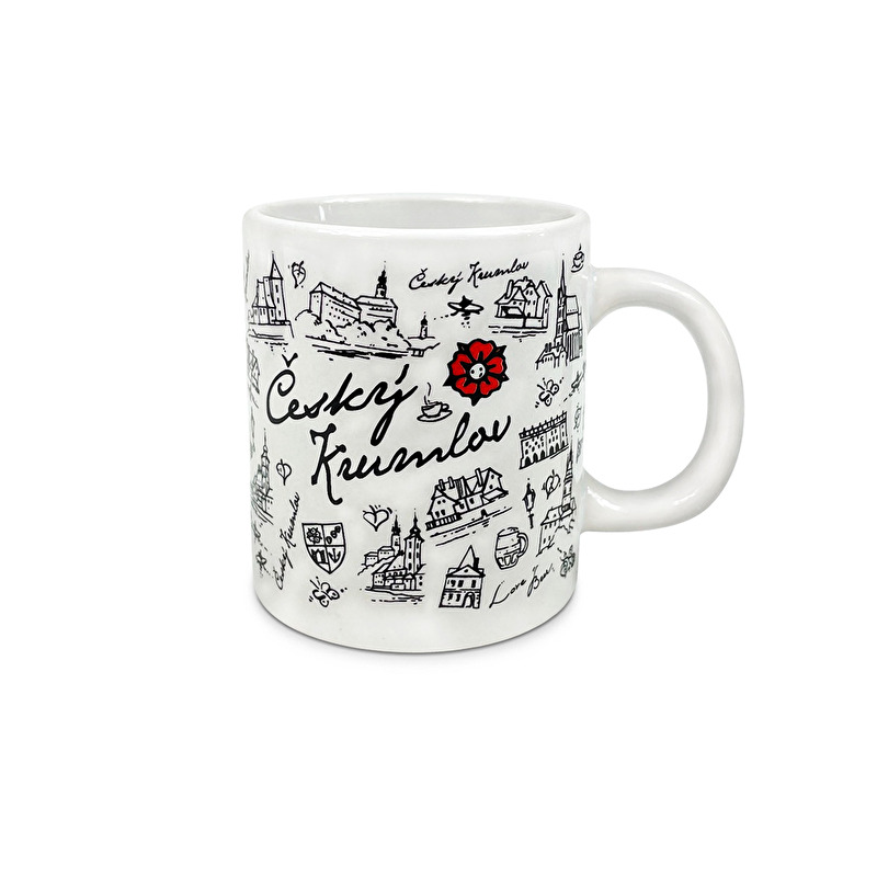 Malý bílý keramický hrníček s drobnými obrázky typickými pro Český Krumlov.