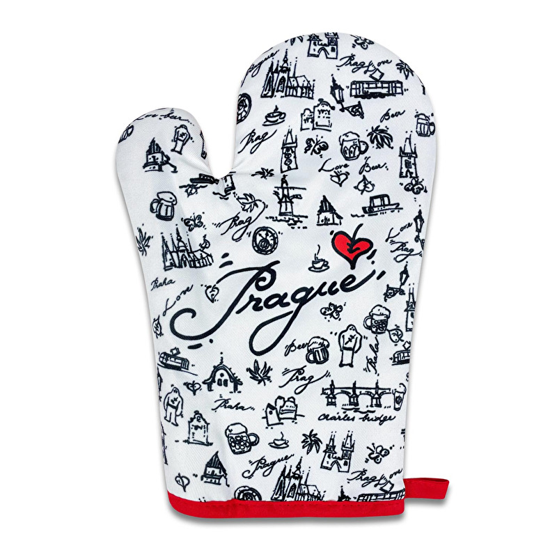 Rukavice na vaření s s potiskem drobných obrázků typickými pro Českou republiku jako je např. pivo, pražský golem, Karlův most atd.