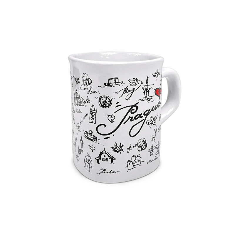 Malý bílý hranatý hrníček s obrázkem představujícím hlavní pražské památky a s nápisem Prague.