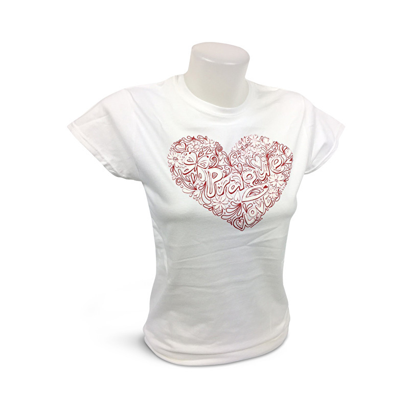 Bavlněné dámské tričko s motivem srdce, ve kterém je nápis Prague. Tričko je v nabídce v černé, bílé, tyrkysově modré a sytě fialové barvě.