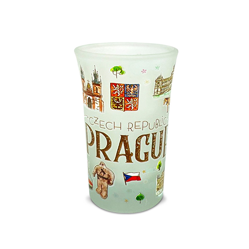 Celoplošně potištěná skleněná miniatura. Obrázek zobrazuje výrazné dominanty Prahy jako je Golem, Národní divadlo, Pražský orloj atd.