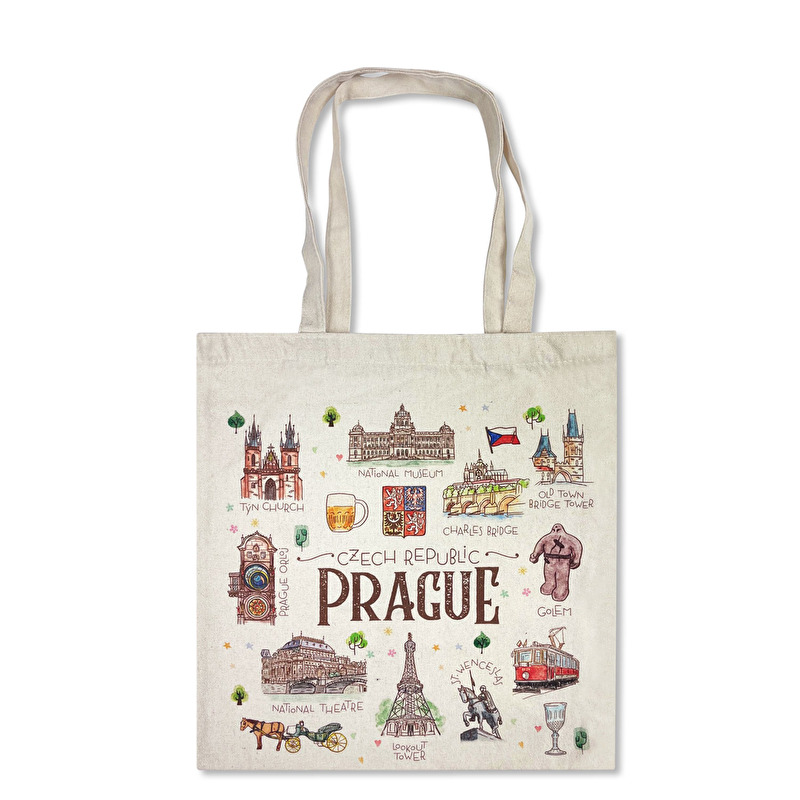 Béžová bavlněná taška s drobnými obrázky zobrazujícími výrazné dominanty Prahy jako je Golem, Národní divadlo, Pražský orloj atd.d.