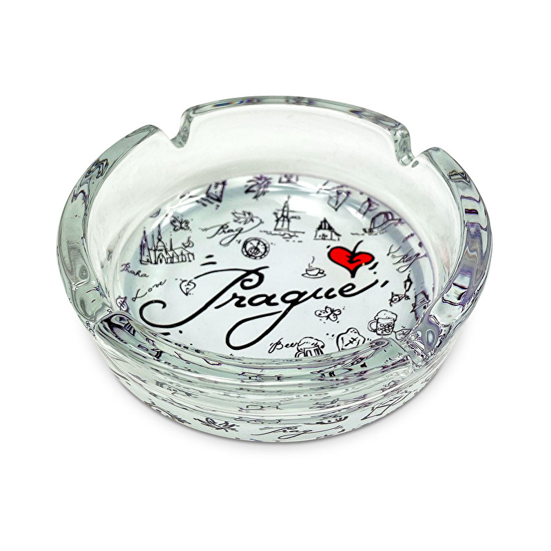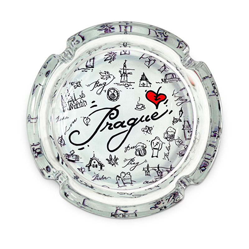 Skleněný popelník v barvách ve stylu retro s obrázkem Prahy zobrazujícím Pražský orloj, Karlův most, Pražský hrad a Staroměstské náměstí.