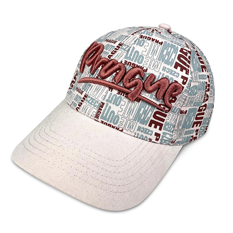 Růžová čepice s kšiltem a celoplošným potiskem textu Czech Me Out a výšivkou Prague.