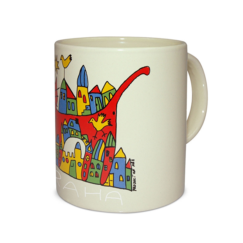 Keramický hrnek na čaj s obrázkem malované kočky a nápisem Praha. Hrneček nabízíme v osmi různých barevných provedeních – bílé, tmavě modré, světle modré, zelené, červené, oranžové, žluté a béžové.