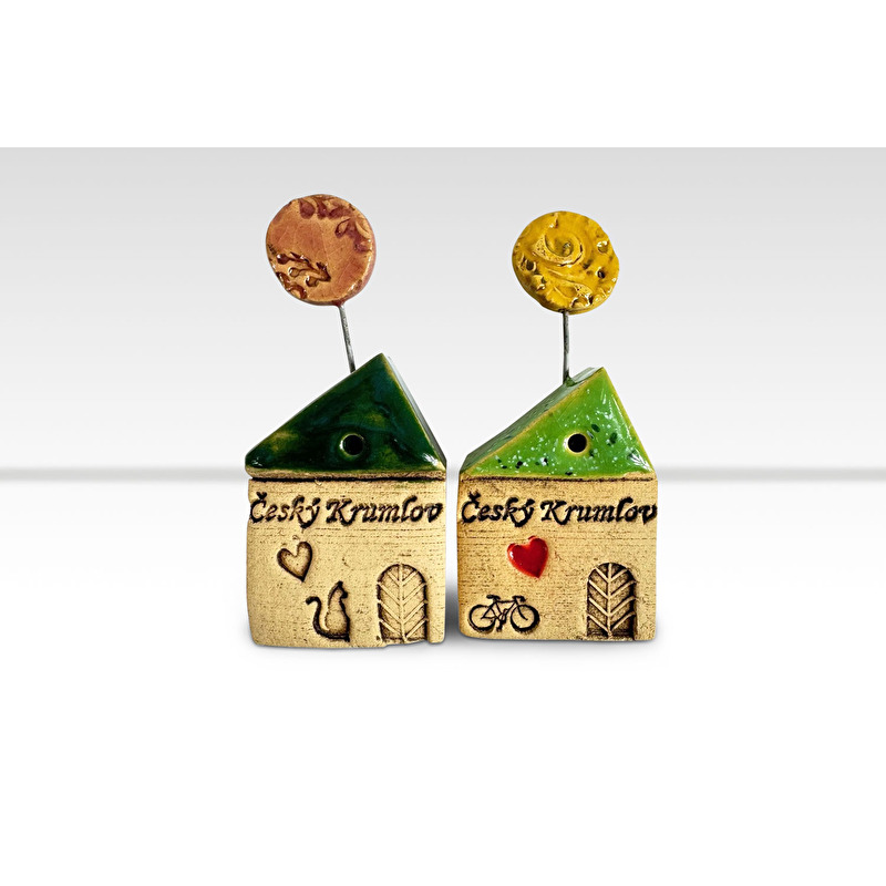 Krásné ručně vyráběné keramické domečky inspirované malebným městem Český Krumlov. Tyto dekorace jsou zdobeny detailními ornamenty a nápisem „Český Krumlov“. Každý domeček je unikátní díky ruční výrobě, přičemž střechy jsou zdobeny jemnými pastelovými barvami. Nad domečky se tyčí drátky s dekorativními motivy, jako jsou červená srdce nebo žluté měsíce.