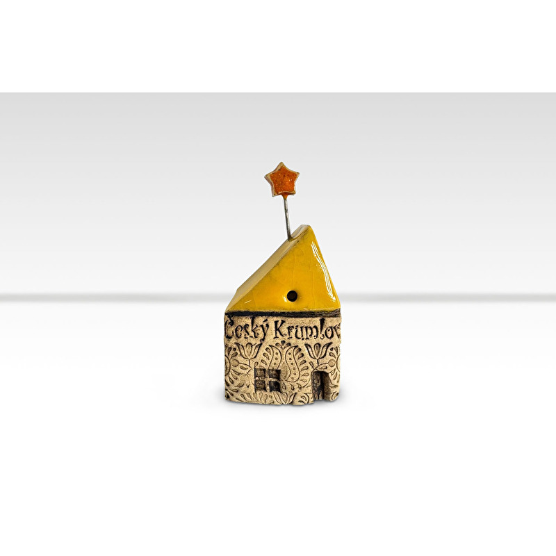 Originální keramický domeček inspirovaný kouzelnou atmosférou Českého Krumlova. Tento kousek je ručně zpracován a zdoben jemnými rytými detaily a žlutou glazovanou střechou. Na špici domečku je oranžová hvězda, která dodává dekoraci jedinečný nádech.