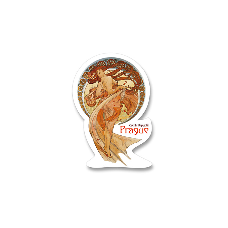 Samolepka s motivem ve stylu secesního umění, zobrazující ženskou postavu s bohatými ornamenty a nápisy „Prague“ a „Czech Republic“.
