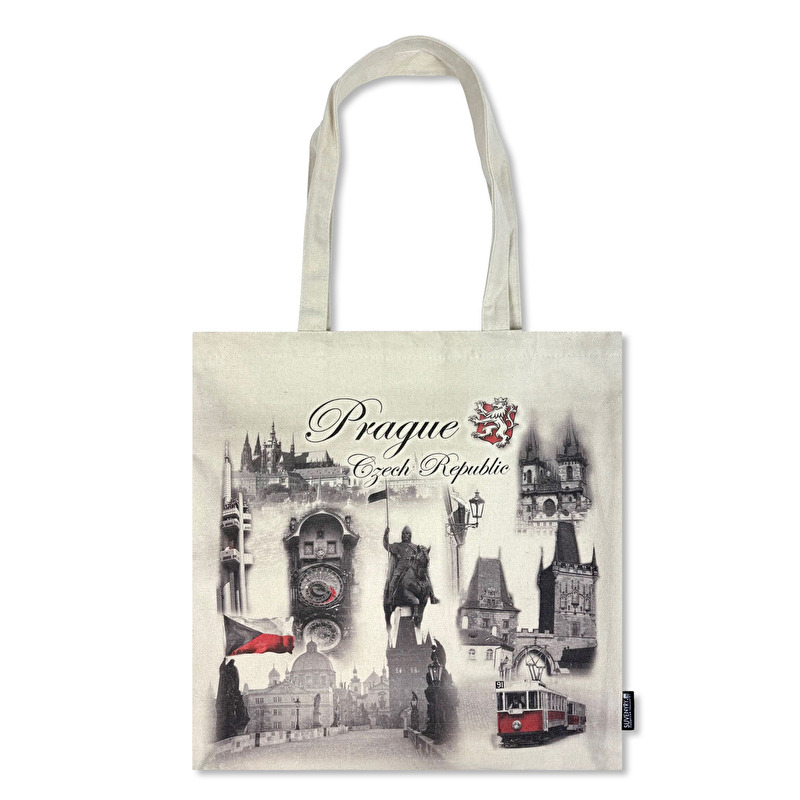 Elegantní plátěná taška s krásným vintage designem, který zachycuje atmosféru Prahy. Na tašce jsou vyobrazeny ikonické památky, jako je Pražský hrad, Karlův most, Pražský orloj, socha sv. Václava, historická tramvaj a další symboly hlavního města České republiky. Nápis „Prague – Czech Republic“ je doplněn o český lví znak.