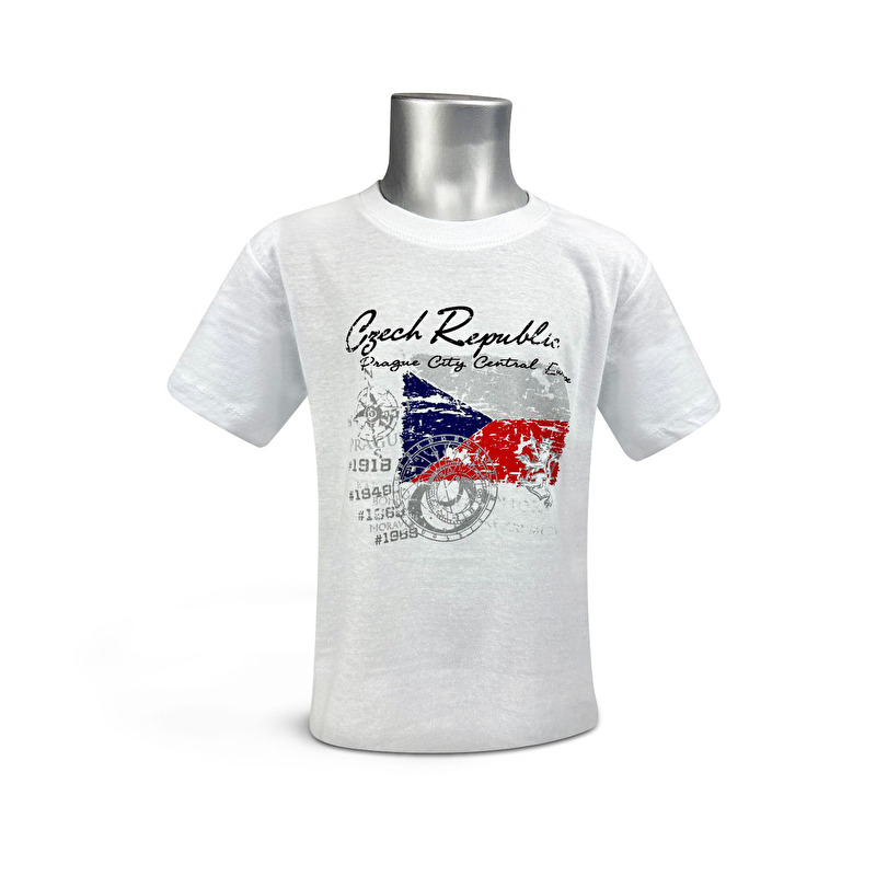 Bílé dětské bavlněné tričko s motivem české vlajky a nápisem „Czech Republic – Prague City Central Europe“.