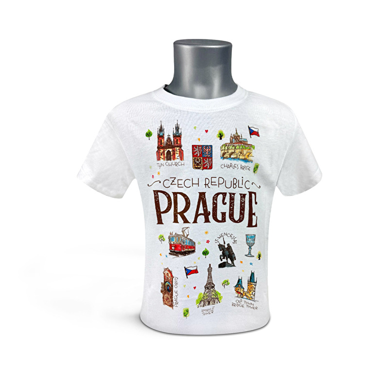Na tričku jsou ilustrace například Týnského chrámu, Karlova mostu, Pražské orloje, Petřínské rozhledny, typické pražské tramvaje nebo koně sv. Václava. Nápis „Czech Republic – Prague“ zdůrazňuje turistický charakter trička. Vyrobeno z příjemného materiálu, ideální suvenýr nebo dárek pro malé cestovatele.