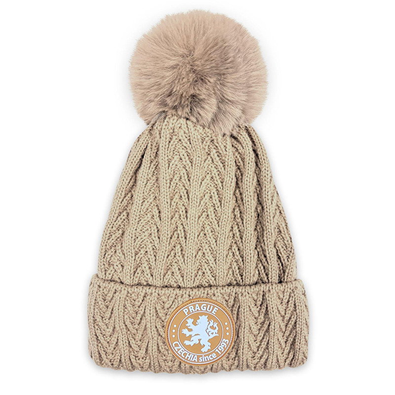 Elegantní a hřejivý kulich v jemné béžové barvě s výrazným vzorem pletení a velkou huňatou bambulí.