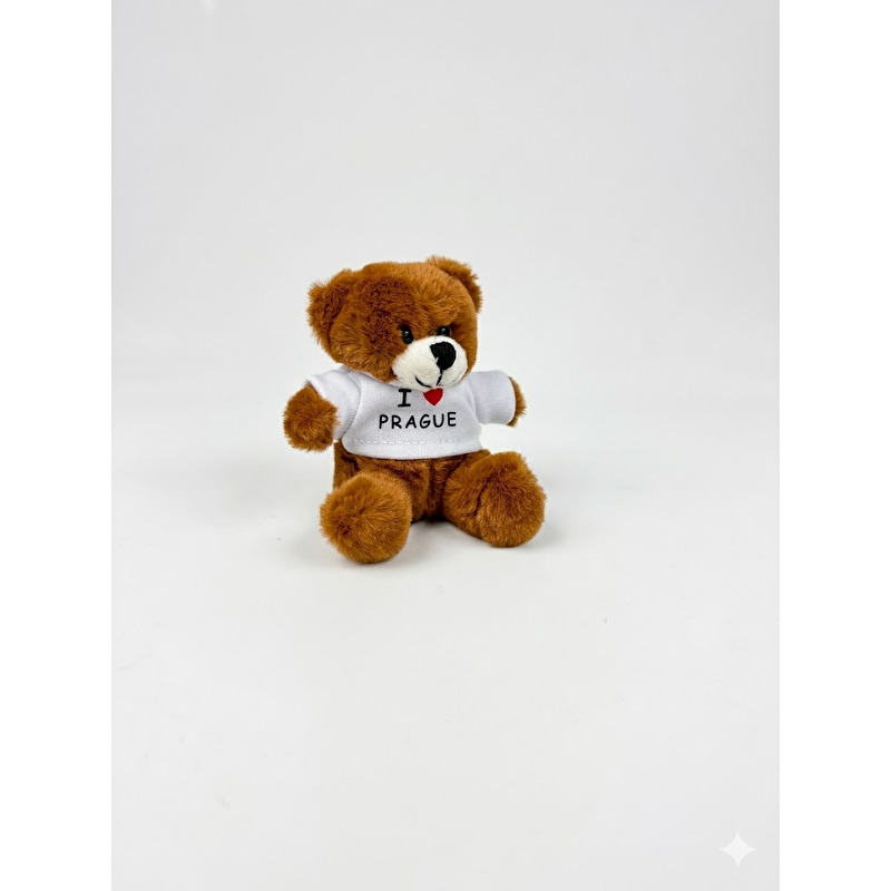 Je oblečen do bílého trička s nápisem „I ❤️ PRAGUE“.