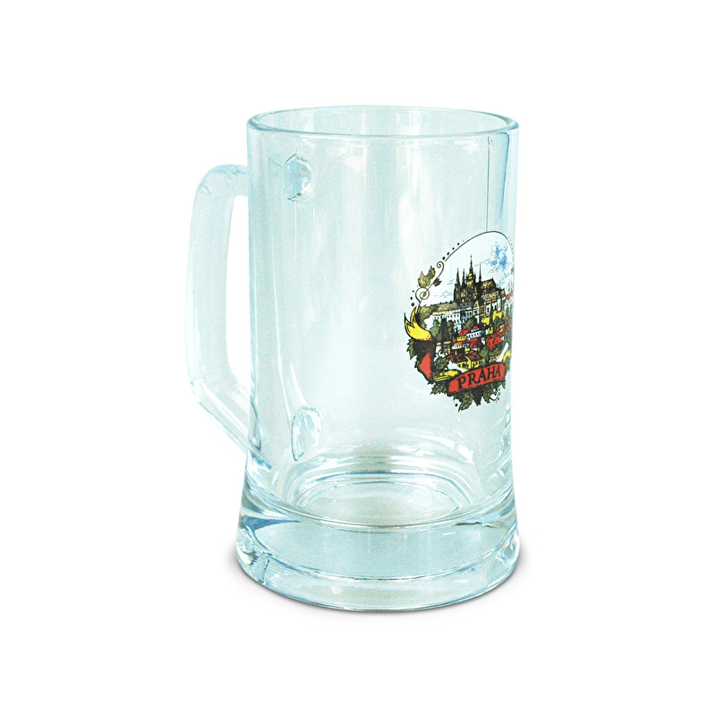 Skleněný dekorovaný korbel s motivem mixu obrázků Prahy.