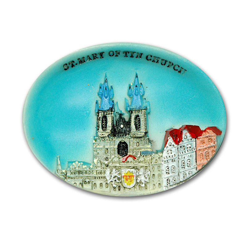 Keramický oválný magnet s motivem Týnského chrámu, který je se svými dvěma vysokými věžemi základní dominantou historického jádra města.