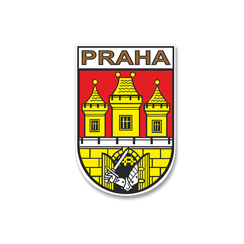 Samolepka ve tvaru Malého znaku města Prahy, který je pouze samotný štít z Velkého znaku města Prahy.