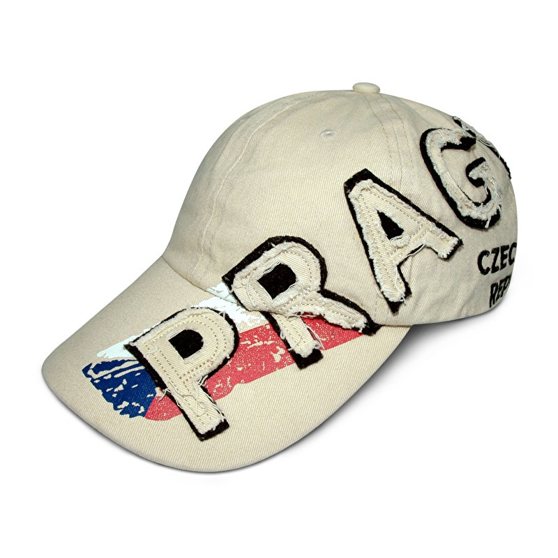 Kšiltovka s textilní aplikací Prague je v nabídce v barvě cihlové, šedé a béžové.